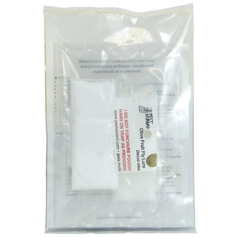 . Highly effective, 60-day lure. Olive fruit fly larvae attack the fruit of the olive tree, causing premature fruit drop or pulp destruction.